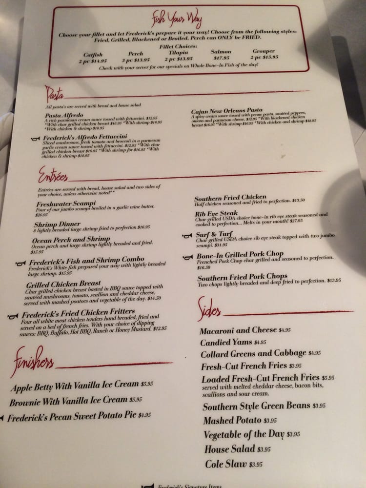 For pasta lovers, their signature Cajun New Orleans Pasta and rich Pasta Alfredo promise a flavor explosion. Don’t forget to save room for dessert; the Frederick's Pecan Sweet Potato Pie is a must-try.
